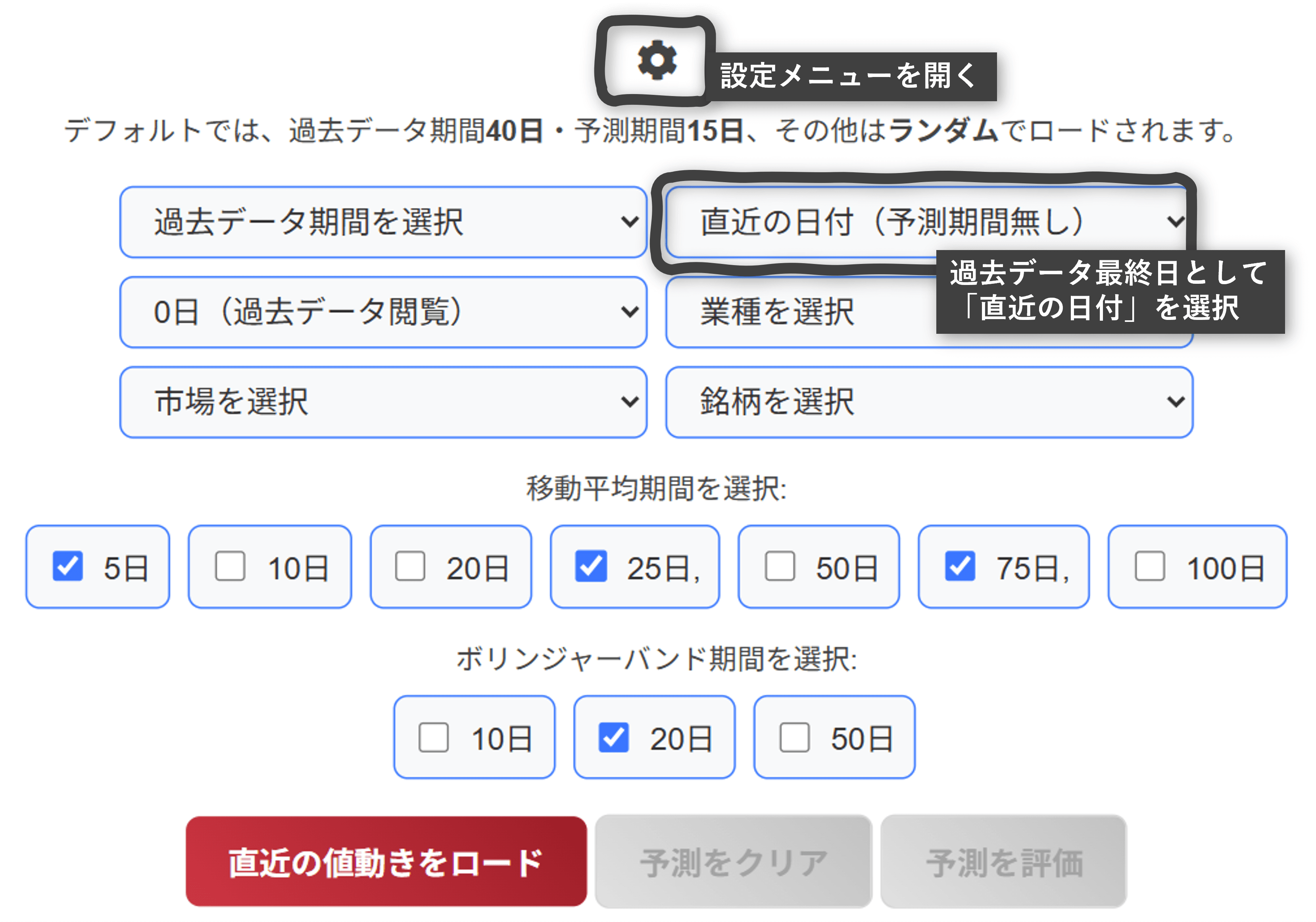 様々な銘柄と過去データ期間を基に、株価推移予測の練習が可能です。